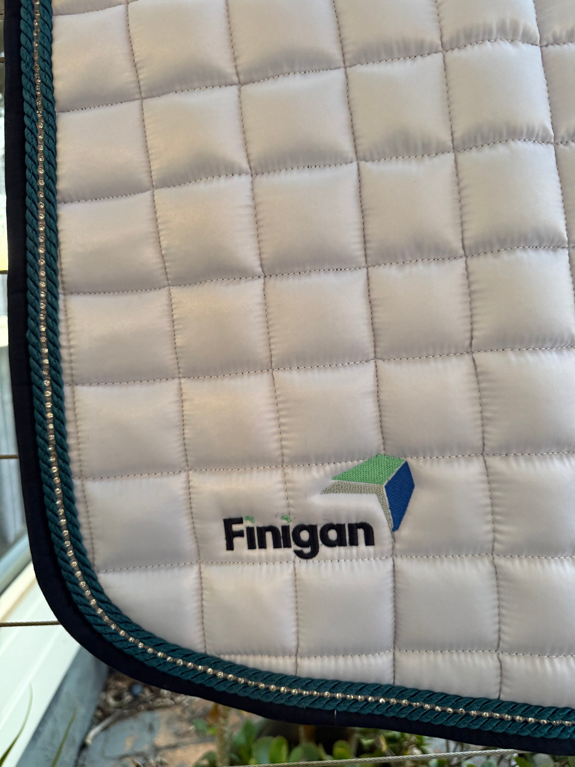 We offer a custom saddle pad with the base colour of white, black, or navy. (some other colours are available if we already have it in stock).